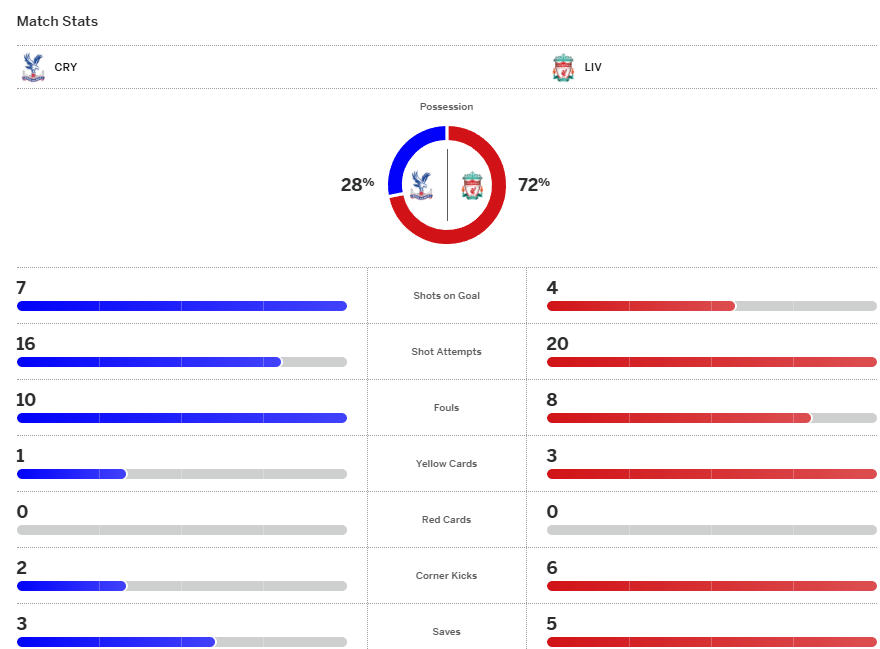 อิสไมล่า ซาร์ ตัวแสบอุตส่าห์ยิงขึ้นนำตั้งแต่ต้นเกมแล้ว ลิเวอร์พูล เป๋ไปเป๋มาโชคดีอลิสซอนยังหนึบเซฟได้หมด แล้วเฟเดริโก้ เคียซ่า ลงมาสำรองก่อนยิงตีเสมอนาทีที่ 87 แต่เกิดดราม่าขึ้นช่วงวินาทีสุดท้ายเมื่อเอ็ดดี้ เอ็นเคเตียห์ ได้ยิงประตูชัยพาคริสตัล พาเลซ ชนะใจหายใจคว่ำ 2-1